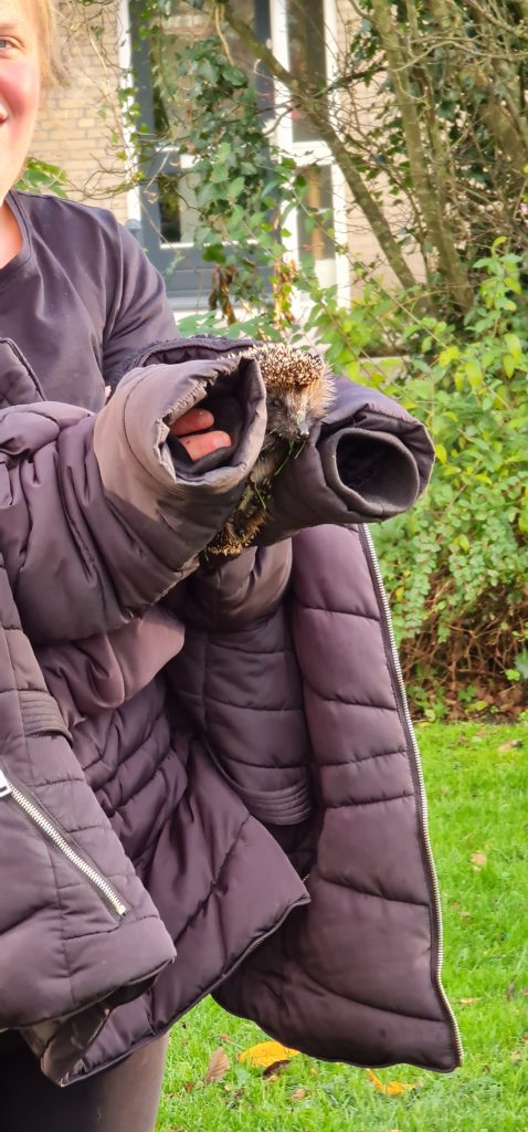 Toen ik thuis was heb ik hem/haar over gezet in een doosje…toen hebben we een tijdje op de Dierenambulance gewacht en in de tussentijd dat we aan het wachten waren heeft hij/zij wat gegeten. Toen de dierenambulance er eenmaal was hebben zij hem meegenomen en naar de egelopvang in Buytenwegh gebracht.