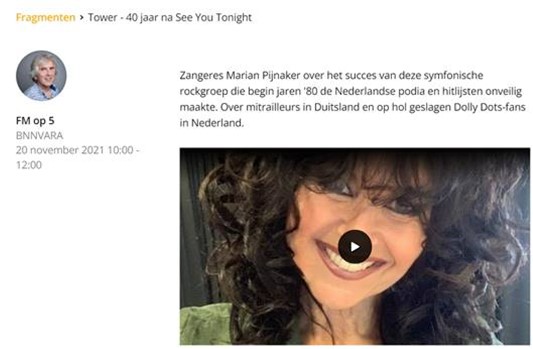 ingezonden Tower 40 jaar december 6, 2021 Redactie Dorpsketting Terugluisteren kan via: https://www.nporadio5.nl/fragmenten/fm-op-5/4fcf2770-6502-48e8-9a00-5ee061924fca/2021-11-18-tower-40-jaar-na-see-you-tonight