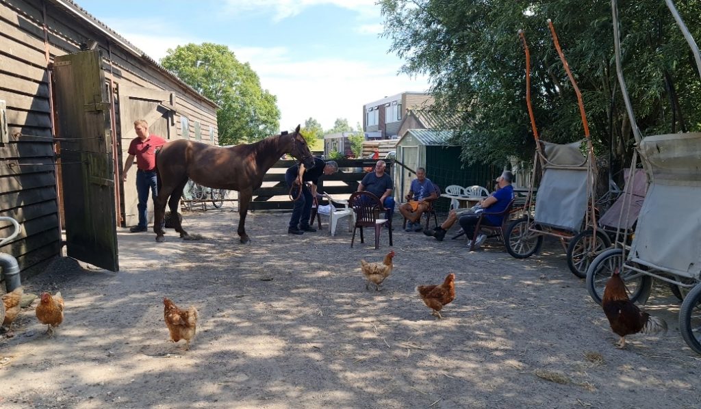 Op een zonnige vrijdagmiddag ga ik op pad om kennis te maken met de Club van 7, die gezamenlijk een prachtige draver hebben aangeschaft. Een deel van de mannen zitten in opstelling achter het hek van de stalhouderij waar dravers op de lange en korte baan getraind worden door Team Vader. Kippen scharrelen in het rond en nemen een stofbad. De haan laat van zich horen. Paarden kijken met hun hoofd over de halve deuren naar buiten en schudden hun manen. Er wordt er een geborsteld. Sulky’s staan werkloos lang de kant. Er heerst een serene rust op deze warme lome vrijdagmiddag totdat de hengst de merrie in zicht krijgt. Dan wordt het onrustig. Het is niet voor niets dat de hengsten gescheiden staan van de merries in hun eigen ruime en bijzondere lichte stallen.
