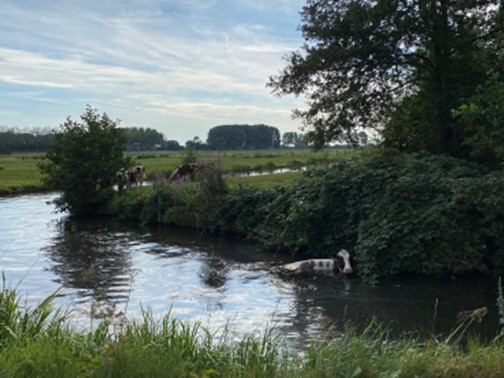 Maandagochtend in de Weipoort richting de hel zag ik deze koe zwemmen, eruit kon zij daar niet, dus even de boerin gewaarschuwd en volgens haar had zij al een flink eind gezwommen. Ze waren blij met de melding en gingen haar eruit halen. Met dit prachtige weer lokt ook voor de dieren het water en ik weet dat koeien kunnen zwemmen, maar er moet wel een weg terug zijn. Dus met een fijn gevoel naar huis gefietst.