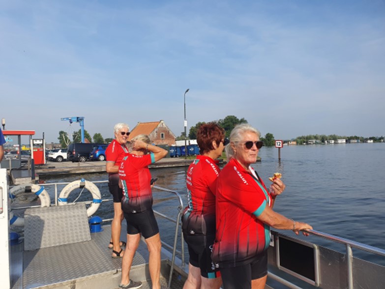 Het is weer zondagochtend en ja, alweer prachtig weertje meneertje. Dus opgetogen naar de start op het Klaverblad. Er zijn captains, die er meestal zijn, maar soms ook niet, dan zijn er vervangende captains, die er meestal zijn, maar soms ook niet. Dan heb je zo ineens een vervanger van de vervanger nodig. En die hadden we hoor! Op de toerkalender stond vermeld, dat we naar de Eerste Aanleg zouden gaan fietsen, maar hé, daar zijn we toch al geweest dit seizoen? Deze goede raad was niet zo duur, want de captain van de dag wist een prachtige route naar de Kaagsociëteit. Nog even gegoogeld hoe laat we daar terecht konden voor de koffie en ja hoor, zij openden op 10.00 uur. Kwam dat even goed uit? Oké, iedereen was al hoog en breed vertrokken, toen wij ook gingen. Via de Bovenmeer, de Zuidbuurt, de Weipoort, het prachtige fietspad naar de Zijldijk (je weet wel, waar die prachtig mooie Lakenvelder koeien staan). We hebben de hele Zijldijk afgefietst, totdat we bij de pontjes kwamen. O jee, de fietsen mochten niet mee,  maar niet getreurd, allemaal vast én op slot gezet en dan naar het pontje voor de oversteek. Twee keer diep zuchten en we waren al aan de overkant en dat voor het bedrag  van € 0,80. Tja, zwemmend doe je er veel langer over hè. En dan een stukje lopen naar de sociëteit. We voelden ons alle 5 helemaal zen en alsof we op vakantie waren. Wat een rust heerst daar. En de koffie was heerlijk ook al moest Loes het zelf halen, of misschien juist daarom wel… We hadden geen haast, dus het tweede bakkie mocht best wel even wat langer op zich laten wachten. We hebben onze ogen uitgekeken, wat een prachtige jachten gingen er voorbij. En ja, er kwam een tijd van gaan. We liepen dus weer terug naar onze fietsen en onderweg kwam Loes nog een vriendin van vroeger, van de handbal en/of hardlopen tegen. Hoe toevallig is dat? Pontje weer op, fietsen weer van slot en op huis aan.