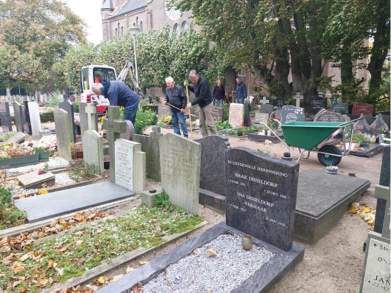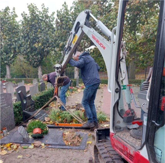 Voorafgaand aan Allerzielen heeft de kerkhofgroep zich in het zweet gewerkt om het kerkhof er piekfijn uit te laten zien. Een van de zaken die zijn aangepakt is het rechtzetten van een aantal grafstenen. Na verloop van tijd willen de stenen nog wel eens verzakken. Om de stenen weer recht, en daarmee goed leesbaar, te leggen is flink wat kracht nodig. Vandaar dat ook de hulp van een kraantje is ingeroepen. Dank aan de mannen die gezorgd hebben dat de grafstenen weer loodrecht liggen en dat het allemaal weer netjes is.