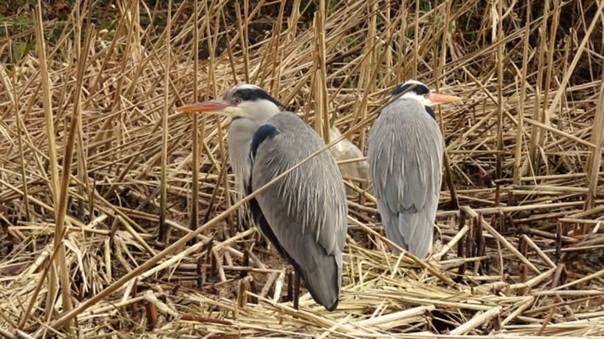ingezonden Reigers in spiegelbeeld november 21, 2022 Redactie Dorpsketting Deze reigers zaten tussen de rietkraag bij de 3 Molens, het lijkt wel een spiegelbeeld Foto: Jan vd Sman