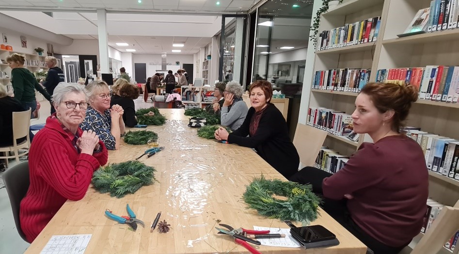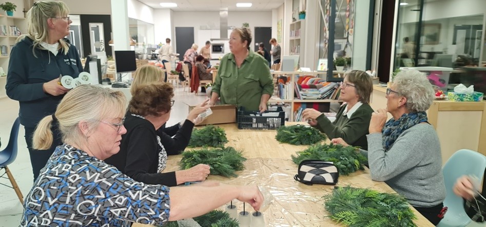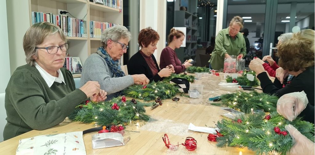 Op 8 december hebben we onder begeleiding van Ingrid Verboon prachtige kerstkransen gemaakt. Er waren 25 vrouwen die zich hiermee bezig hielden. Maartje van Dijk was de charmante assistente. Er waren drie tafels met 8 vrouwen die zich goed konden uitleven.