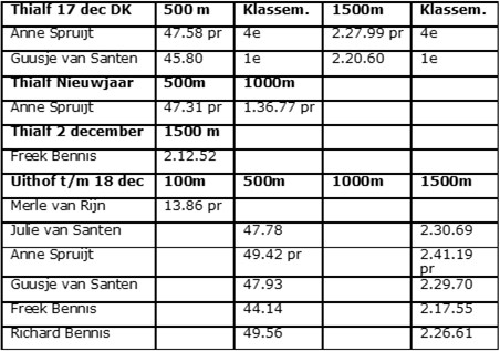 Ook in de laatste maand van het oude jaar waren de Stompwijkse schaatsers actief in wedstrijdverband. Een aantal reisden af naar Thialf om hier op snel ijs nieuwe records te kunnen rijden. Op 17 december namen Anne Spruijt en Guusje van Santen deel aan het Afstandenkampioenschap van het district Sassenheim. Guusje won bij de meisjes jun A zowel de 500 meter (45.80) als de 1500 meter (2.20.60). Anne eindigde bij de meisjes jun C op beide afstanden als 4e met nieuw p.r.’s. Op de 500 meter scoorde ze 47.58 en op de 1500 meter 2.27.99, een verbetering van haar beste tijd met ruim 12 sec.