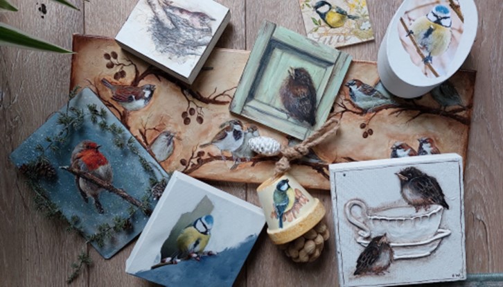 Vogeltjes brengen de lente met hun gezang, voor mij altijd een teken dat het voorjaar weer in aantocht is. Met de vogeltelling in het vooruitzicht is het leuk om ze zelf een roodborstje, pimpel- of koolmeesje te plakken of schilderen. We werken dit keer niet met servetten, maar met computer fotoprintjes. Het is een leuke workshop waardoor je deze gevederde vriendjes beter leert kennen. Je kan dan kiezen uit een doosje, hout of linnendoekje en de kosten zijn 12,50.