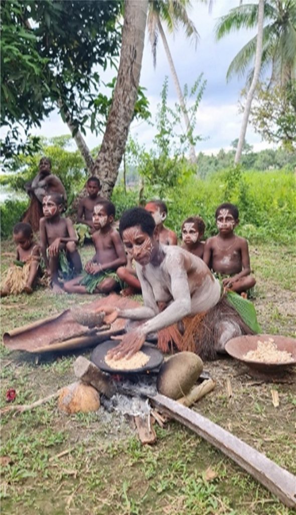 We krijgen gedemonstreerd hoe je van een soort ‘palmboom’ meel maakt. Eerst steekt een man de bast eraf met twee speren en stampt de inhoud tot pulp. Dat gaat in een gevlochten korf en een vrouw gooit water uit de rivier eroverheen en perst het uit. Dit wordt een aantal maal herhaald. Een soort kokosmelk ontstaat. Dit wordt door een andere vrouw verhit op een vuur, waarna door weer een andere vrouw kokend water erbij gedoseerd wordt, waarna het gaat binden. Zo ontstaat een soort deeg. Dat kun je al eten, maar ziet er niet smakelijk uit. Vervolgens wordt in een lage wok een deel van het meel gebakken en uitgerold en platgedrukt met een kokosnoot. Zie hier het recept voor heerlijke Papoease pannenkoeken. Eet smakelijk!